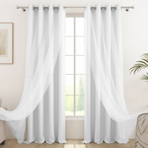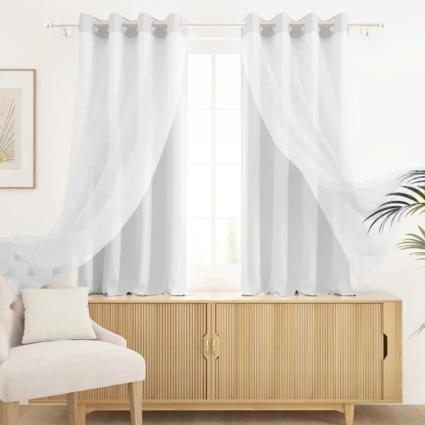 Serene Duo White Curtains by Sedar feature a solid blackout design crafted from faux silk polyester and linen sheer polyester. Available in multiple lengths, these versatile curtains provide privacy, light control, and an elegant look for windows and doors.