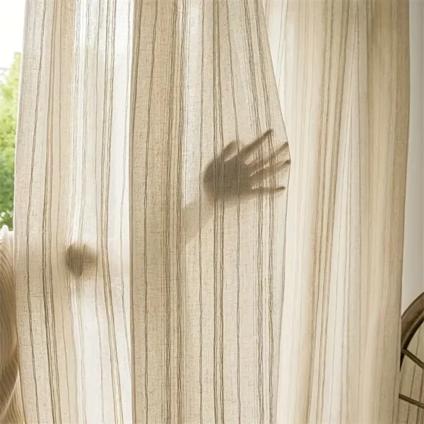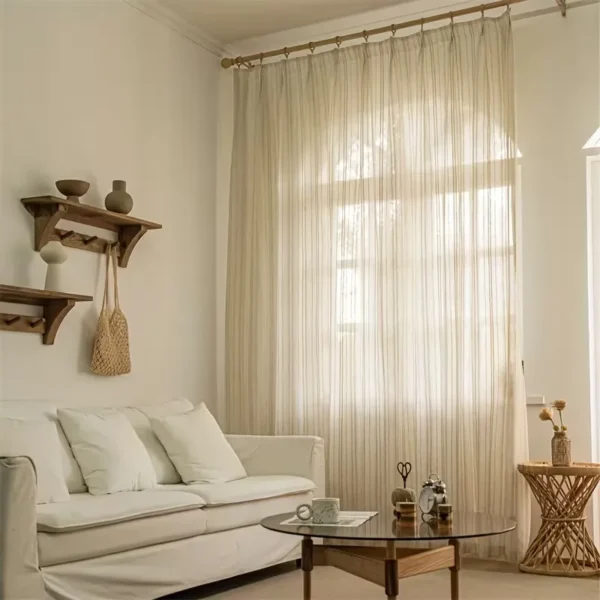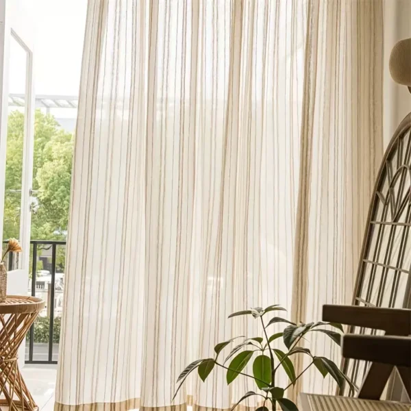 Lightweight sheer voile curtains with elegant vertical stripes inspired by Japanese wood texture. Gently filter daylight while maintaining an open feel. Ideal for living rooms, bedrooms, and doorways, also functioning as stylish fabric partitions for modern interior spaces.